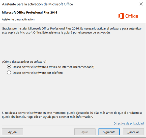 Por favor siga este tutorial para descargar, instalar y activar Office 2016.