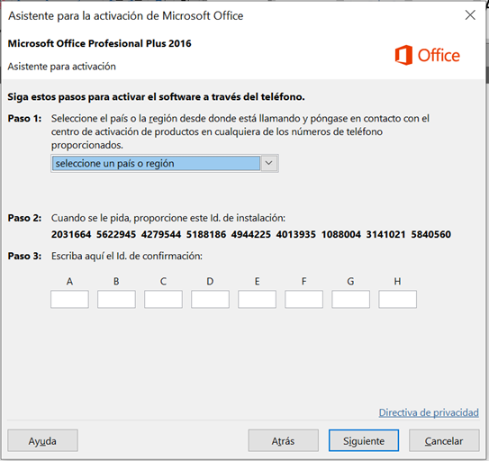 Escriba o copie la licencia y luego haga clic en el botón “Activar Office” que se desplegará una vez que haya escrito la licencia, luego te mostrara el “Asistente para activación”.